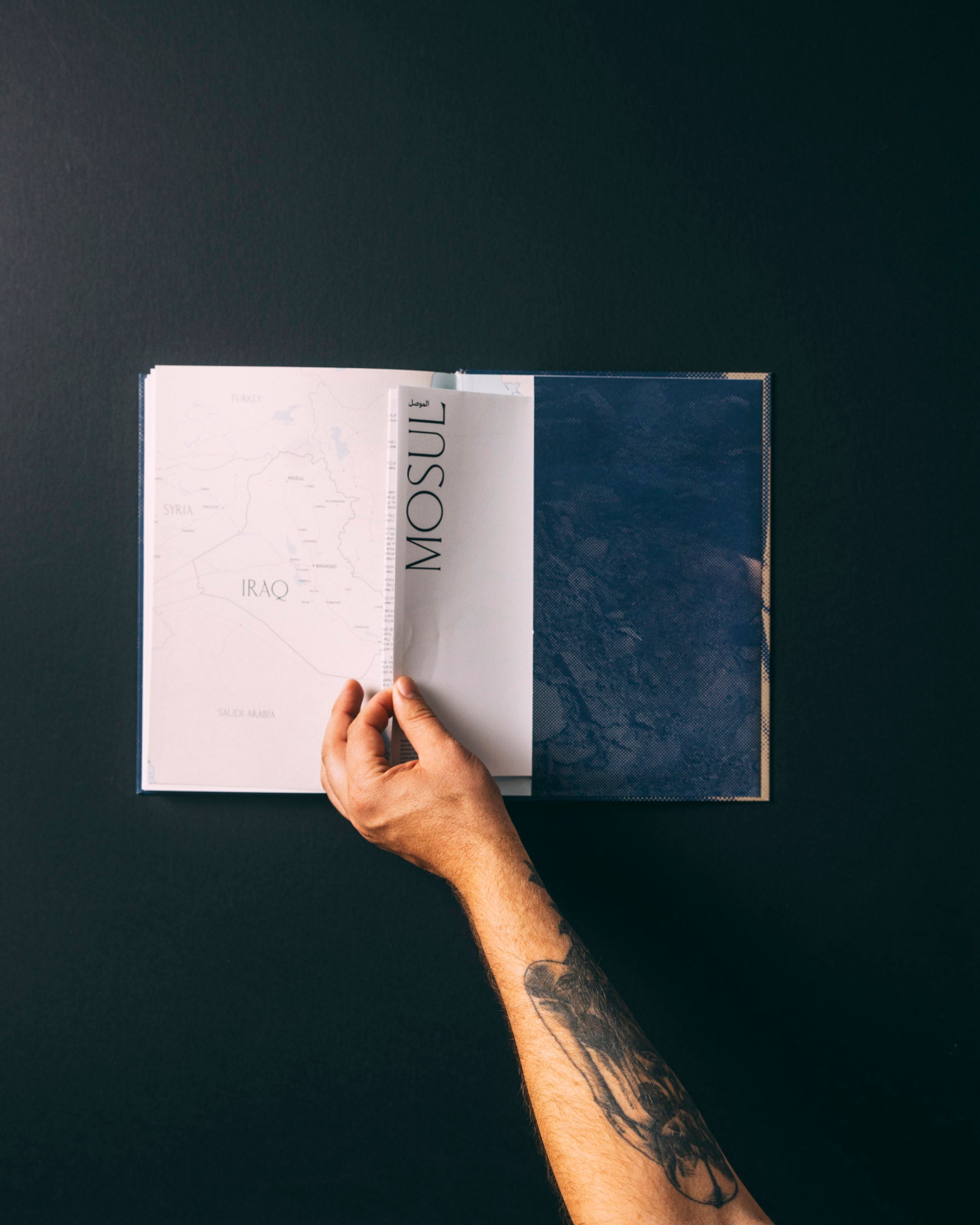 The book includes a foreword from Azmat Khan, an essay by Campbell MacDiarmid, and a pullout map. It is designed by Jason Koxvold of Gnomic Book and written in both English and Arabic.